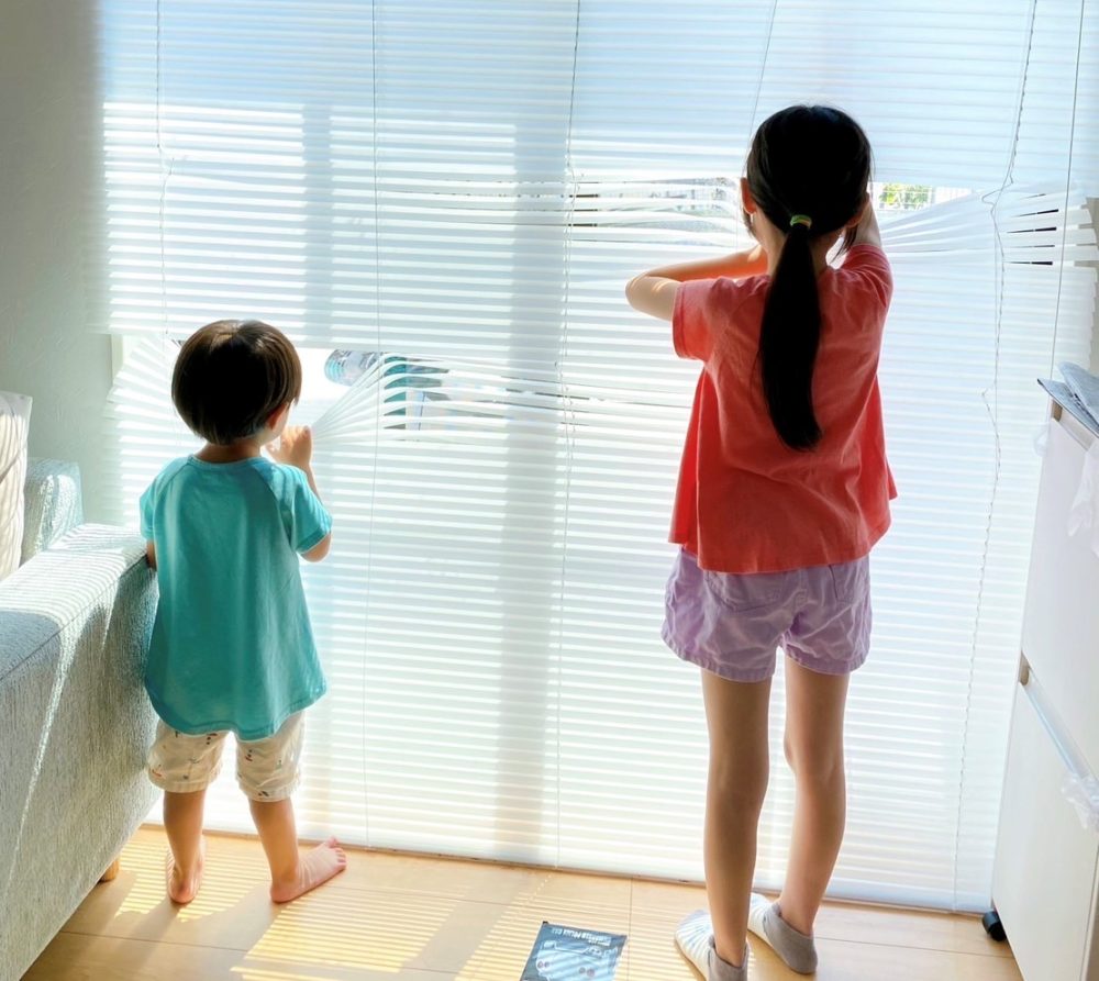 ブラインド越しに手を振って