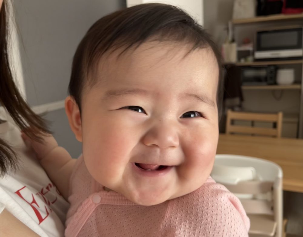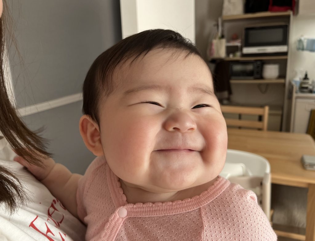 満面の笑みで手足をバタバタさせて喜ぶ姿。